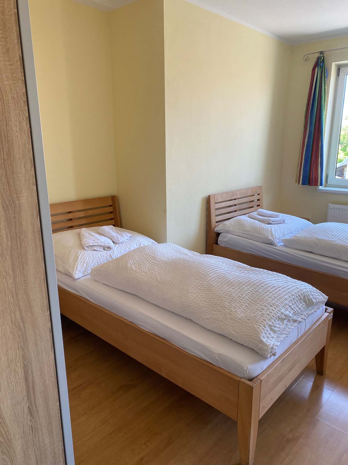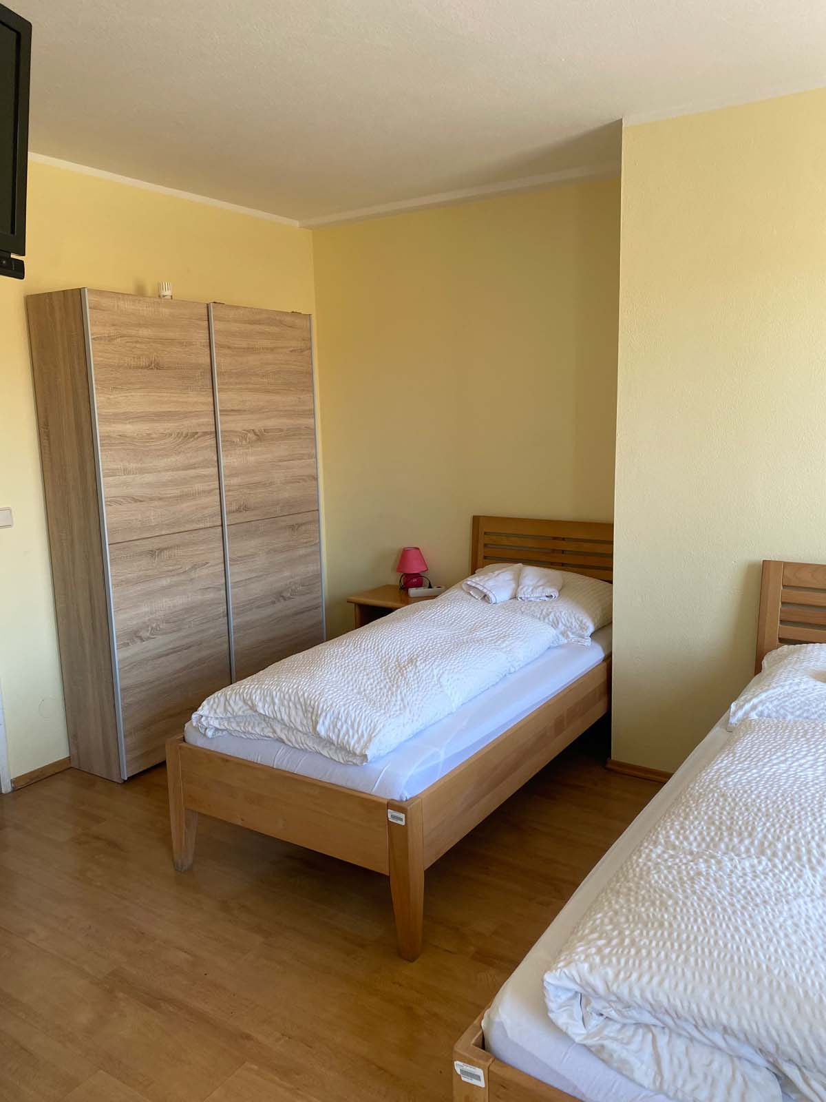 Das Doppelzimmer der Kategorie 1 bietet eine angenehme Unterkunft für zwei Personen in Wien-Favoriten. Das Zimmer befindet sich im ersten Stock und verfügt über Fenster zur Hauptstraße. Zwei komfortable Einzelbetten mit den Maßen 90 × 200 cm sorgen für erholsame Nächte. Durch die praktische Raumaufteilung eignet sich das Zimmer sowohl für Paare als auch für Freunde oder Kollegen, die gemeinsam reisen und eine funktionale Unterkunft in Wien suchen.