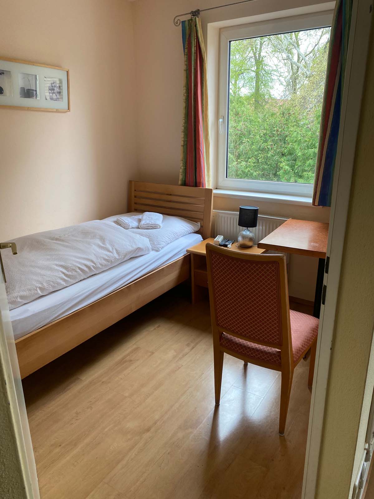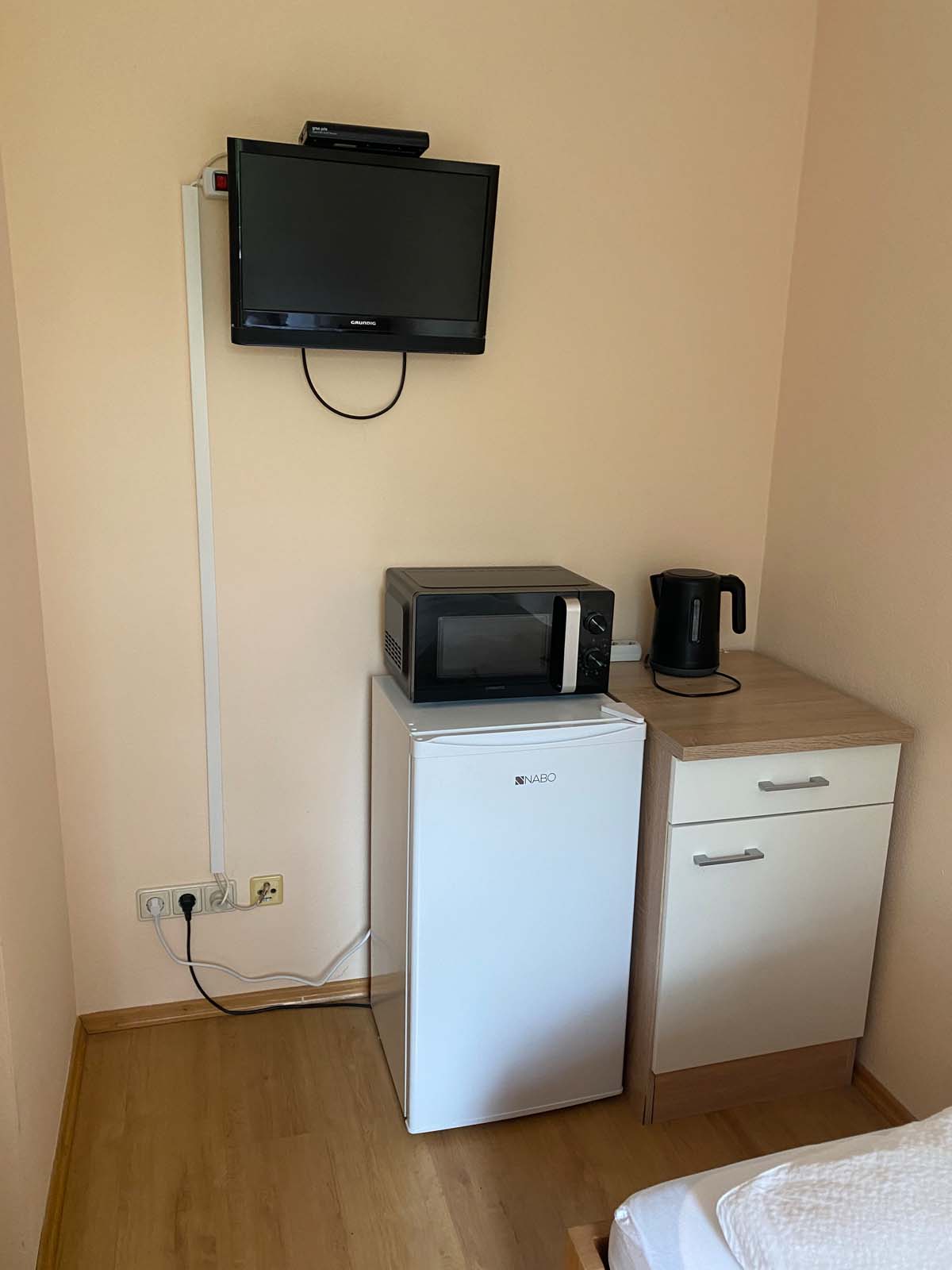 Das Dreibettzimmer ist funktional eingerichtet und bietet alles, was Sie für einen entspannten Aufenthalt benötigen. Ein Kühlschrank, eine Mikrowelle und ein Wasserkocher stehen direkt im Zimmer bereit. Zusätzlich wird Geschirr zur Verfügung gestellt, sodass Sie kleine Mahlzeiten oder Getränke bequem zubereiten können. Die gemütliche Einrichtung schafft eine angenehme Atmosphäre und macht das Zimmer sowohl für kurze Aufenthalte als auch für längere Aufenthalte komfortabel und praktisch.