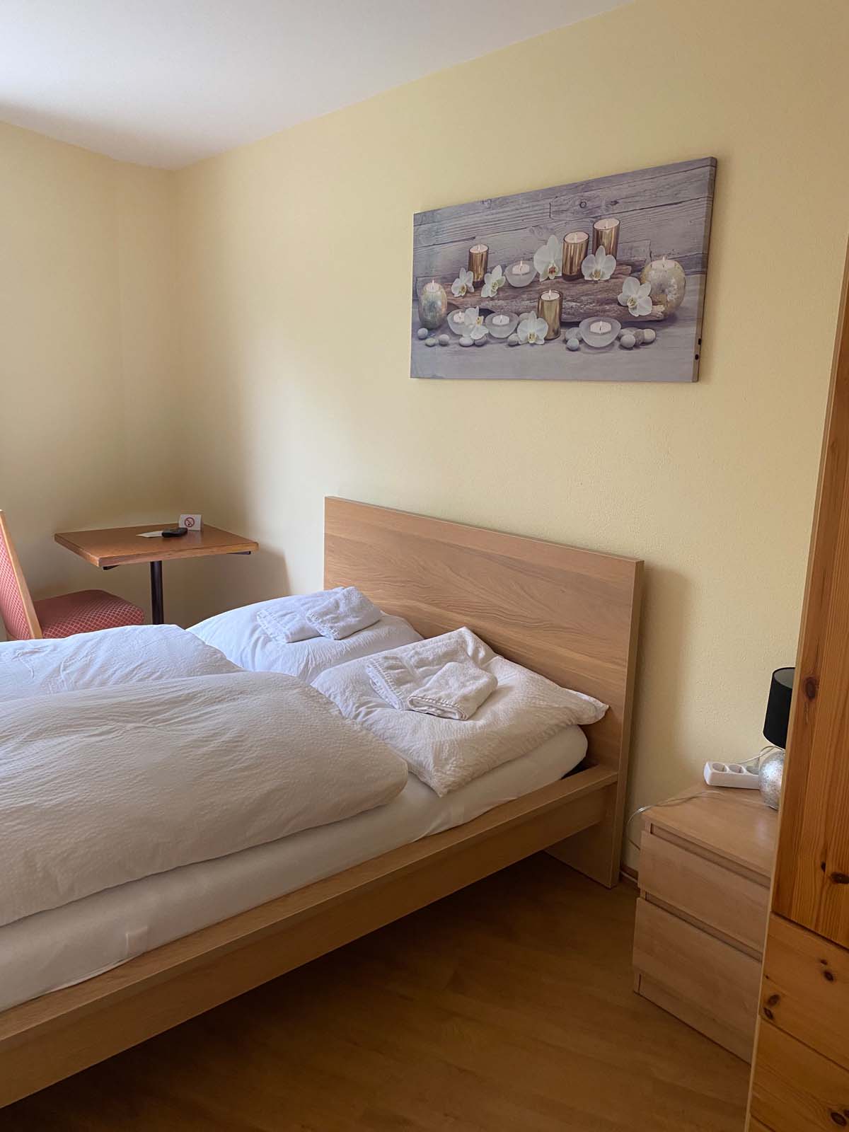 Unser Dreibettzimmer bietet eine gemütliche Unterkunft für bis zu drei Personen. Es liegt im ersten Stock und bietet Fenster zur ruhigen Hofseite. Das Zimmer verfügt über zwei separate Schlafräume: ein Doppelbett Queensize (140×200 cm) sowie ein Einzelbett (90×200 cm). Das eigene Badezimmer sorgt für Privatsphäre und Komfort, während die praktische Raumaufteilung ideal für Familien, Freunde oder kleine Gruppen geeignet ist.